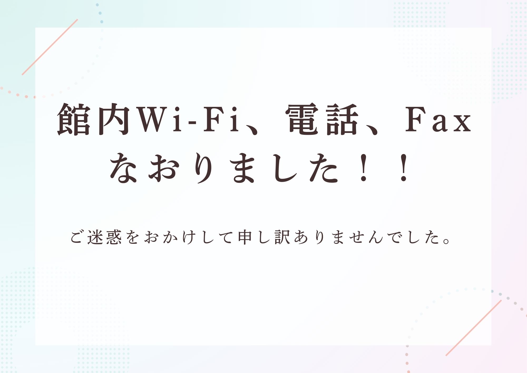 お知らせ 2026.01.15客室Wi-Fiに関するお知らせ(使用再開) 先日お知らせいたしました、客室Wi-Fiですが工事が完了し使用していただけるようになりました。クレジットカードの使用不可等、ご宿泊のお客様には大変ご迷惑をおかけいたしました。申し訳ございませんでした。大観荘 Tweet Share RSS お知らせ
